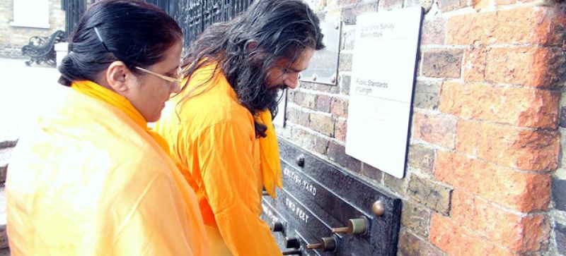 Swami ji and Didi observing the British Standard Units of Length at Greenwich, UK